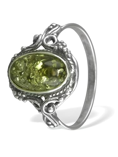 Vintage Oval Baltic Amber Sterling Silver Ring in Ornate Victorian Setting for Women Ladies Girls - Green Amber Jewellery - Size O
